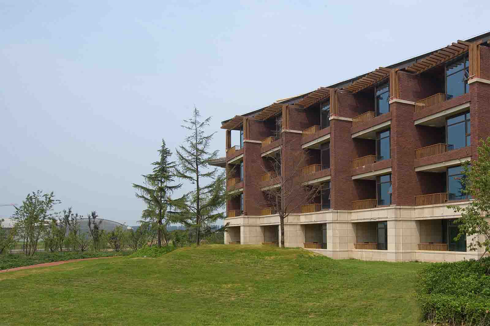 酒店建筑设计的立意可以提炼为“西式肌理,中国风骨”的概念。整体的比例、构成、样式均吸取了美国“草原式”建筑的经典建筑语汇---平缓的屋顶,深远的出檐,水平的线条感。材料的选择上充分尊重当地的地域文化特征并将中式传统建筑语言加以提炼,选择具有明显中国气息的手工仿古面砖做主要的外装材料。在基座部位用干挂石材勾勒出精致耐看的建筑细部,屋顶檐口部位采用灰色的金属封檐板,屋面瓦则采用具有中国传统建筑韵味的暗红色水平机制瓦。整体呈现出温暖惬意又不失庄重的建筑基调。
