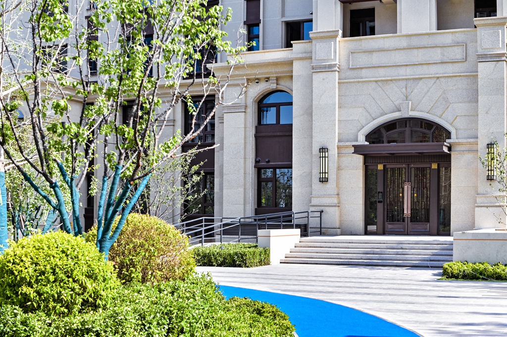 建筑采用现代语汇演绎法式经典,反复推敲三段式构图的比例、尺度、收分,精心打磨线脚、柱式、拱券、窗套、孟莎顶、入口等细部设计,营造优雅、浪漫、稳重的建筑气质。建筑色彩以浅米黄为主体色,以深咖色和深灰色为辅助色,建筑材质采用外挂石材和高品质仿石涂料,强化品质感和设计感。